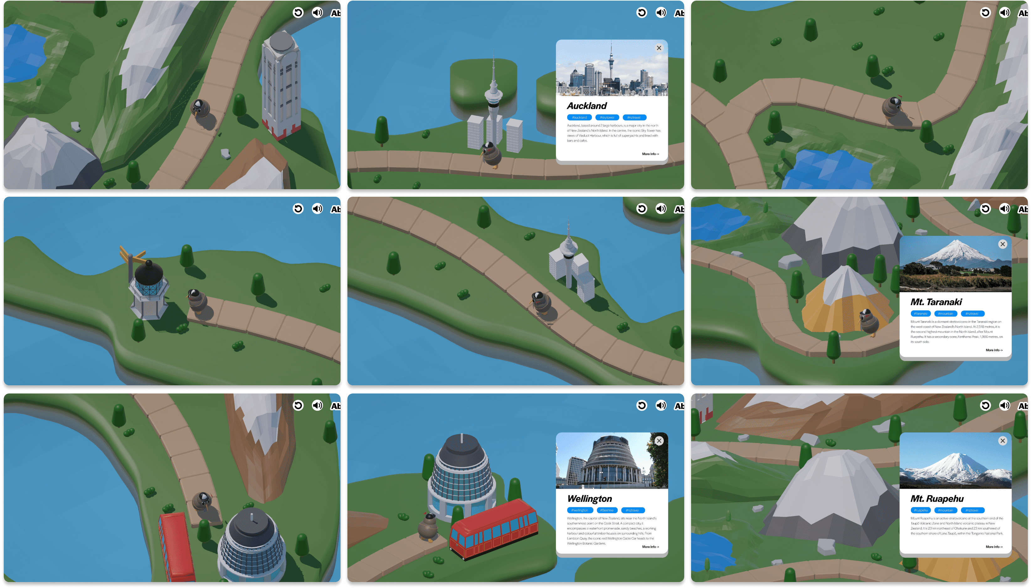 "This project uses a 3D interactive website to let users explore New Zealand landmarks, gain information, and spark curiosity through engaging and realistic experiences."